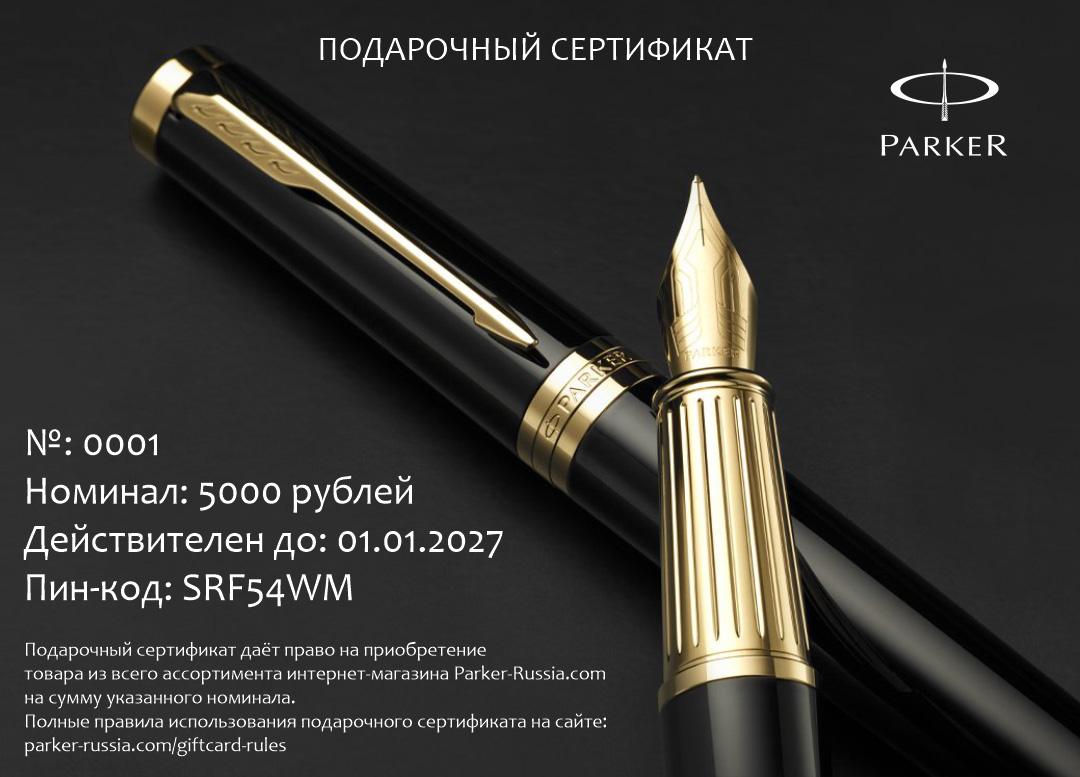 Подарочный сертификат Parker 5000 от официального дилера Parker в Армавире. Вы можете дополнительно заказать гравировку, которая подчеркнет Вашу оригинальность и придаст памятность статусному подарку. Все ручки Паркер поставляются в фирменном футляре.